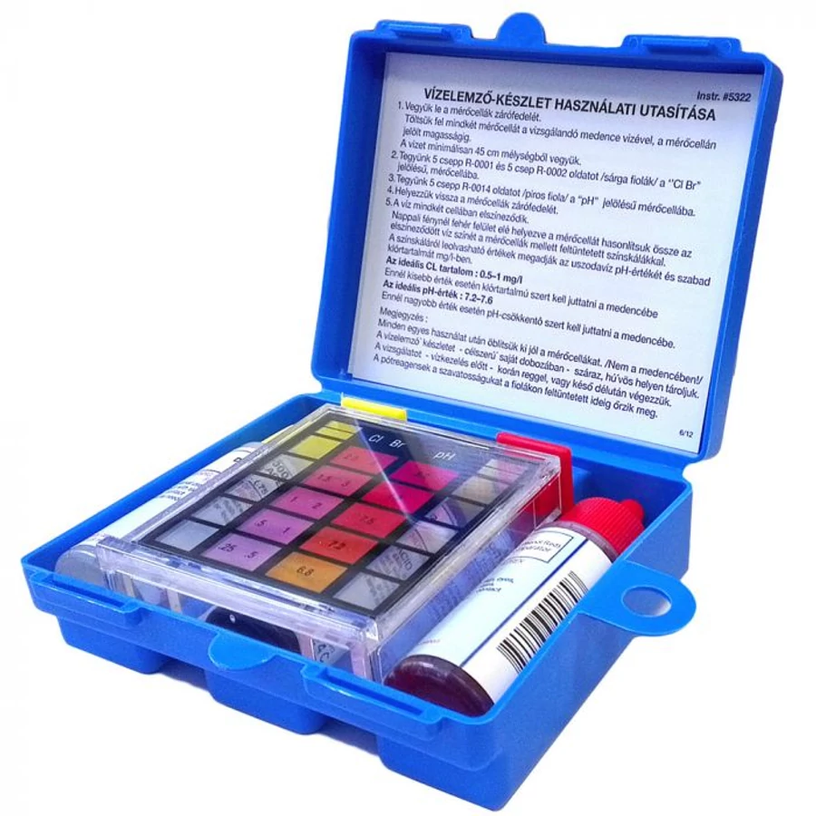 Ez a folyadékos vízelemző meghatározza a medencevíz szabad klór- és brómtartalmát, valamint a víz pH értékét, így a vegyszerezést pontos értékek mentén lehet módosítani. A készlet több mint 100 méréshez elegendő!