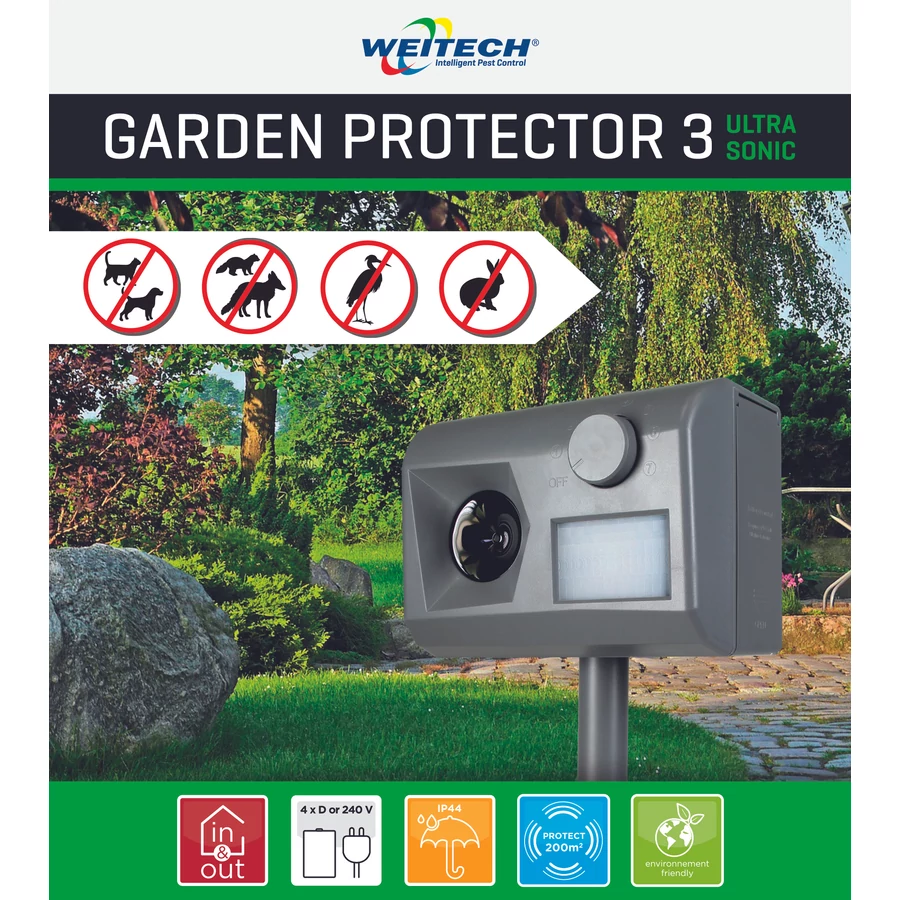A Weitech kisállatriasztó kutya, macska, nyest, róka, gém, nyúl elriasztására alkalmas 200 m2 hatótávolságon belül. Elemes tápellátásának köszönhetően kertben, teraszon is alkalmazható, időjárásnak ellenálló kivitel. A készülék infravörös érzékelővel rendelkezik, a mozgásra reagálva ultrahangot bocsát ki mely elriasztja a kártevőket. 7 különböző állítható ultrahang-frekvencia választható, a mozgásérzékelő hatósugara: 16 m, 90o.